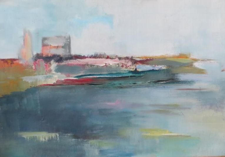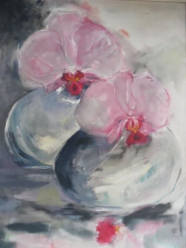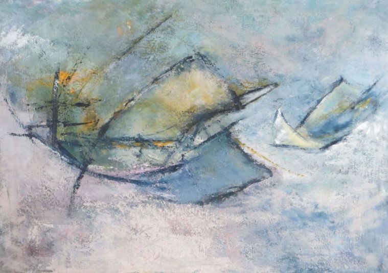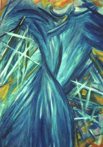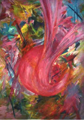 Frühling ... geballte Kraft, die sich in zarter Farbigkeit entlädt. Rosa - hellblau - lindgrün - türkis, wild durcheinander wirbelnd. Chaotische ungeordnete Strukturen einerseits, fest umrissene zwiebelförmige Gestalt andererseits, und leicht flatternd zwischen Form und Ungeformten ein Schmetterling ... Wandlung - Entstehung - Frühling.