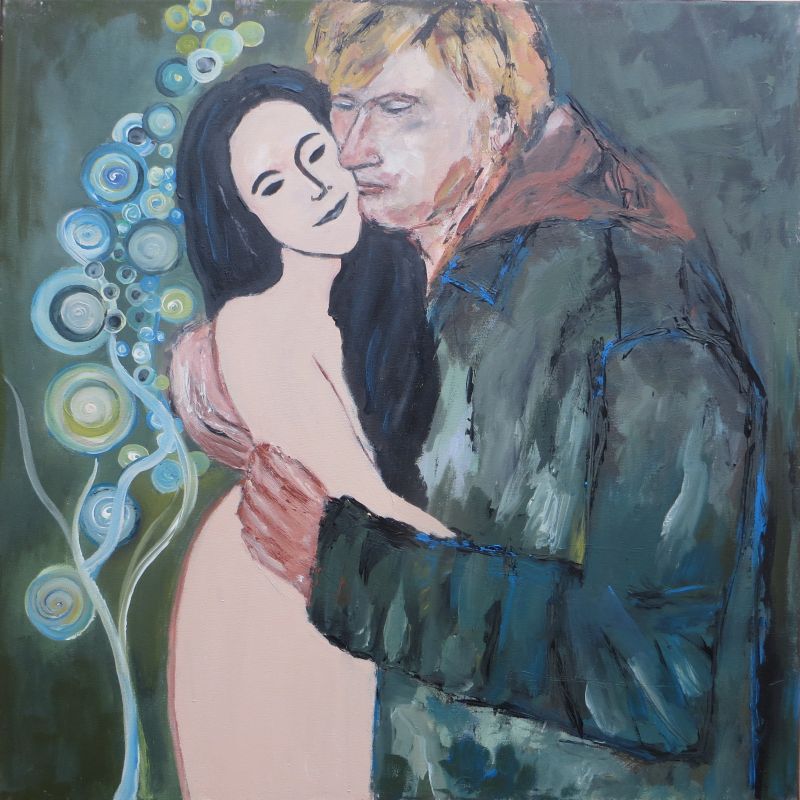 In sich versunken, gerundet und abgeschottet. Angewinkeltes Knie. Kopf auf angewinkelte Arme gestützt. In sich ruhend, innehaltend. Traurig - Warum? Nachdenklich - Worüber? Machtlos gegen das Außen und den Kampf im Innern. Einigeln und stark sein. Nur nicht zu lange baden in bittersüßer Melancholie, im lilafarbenen Alles und Nichts. Die Welt ist wie sie ist.